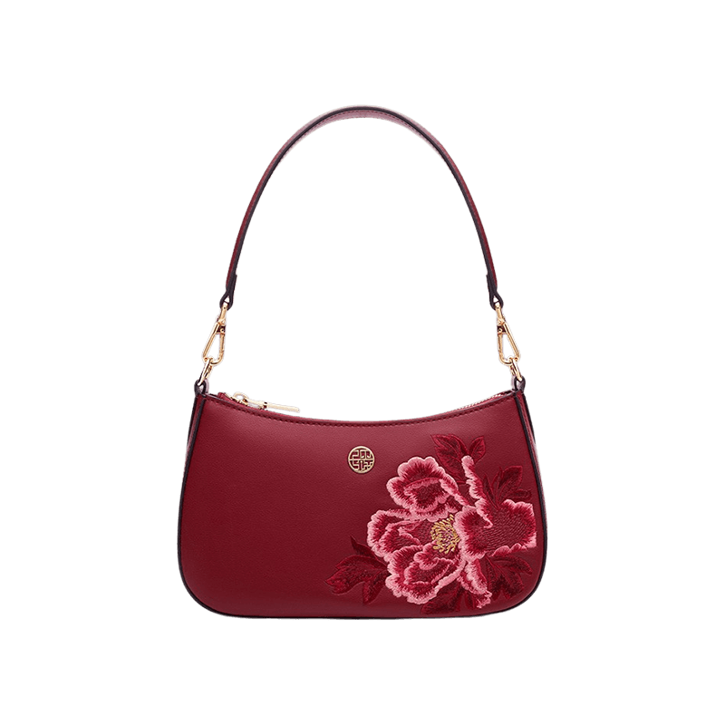Embroidery Leather Red Shoulder Bag Peony Women’s Hobo Handbag