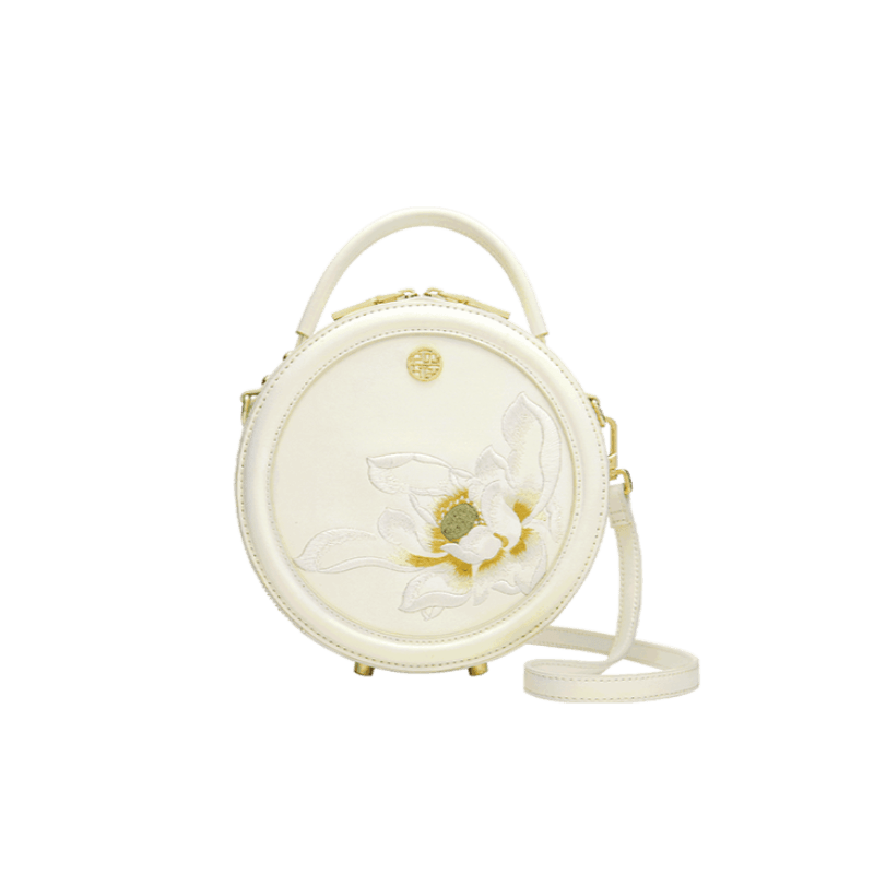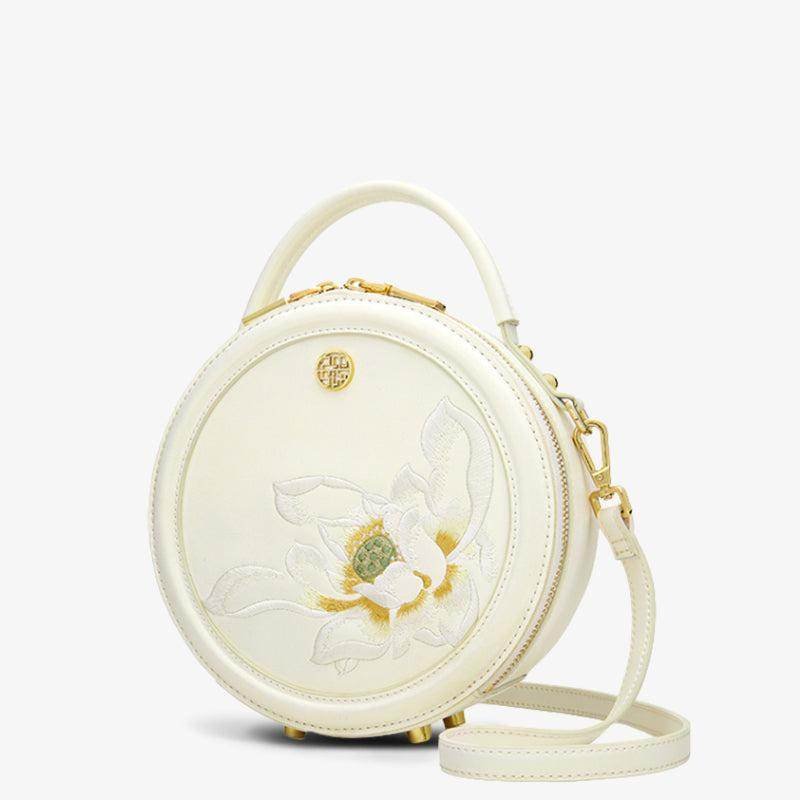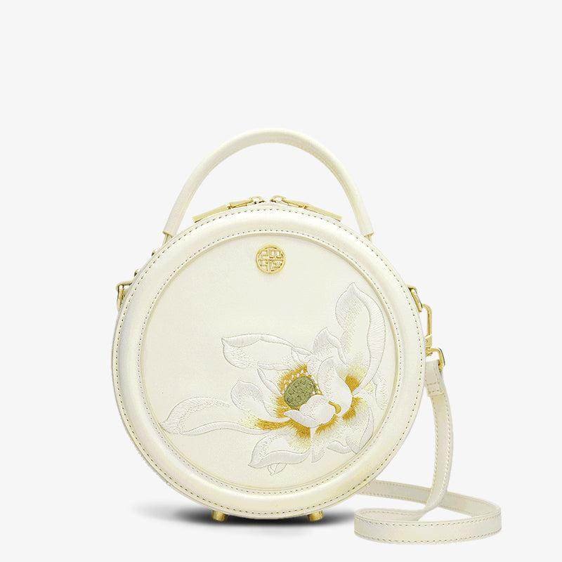 Be the first to review “Embroidery Leather White Round Handbag Lotus”