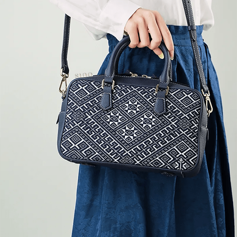 Zhuang Brocade Flying Swallow Motif Embroidered Leather Crossbody Bag